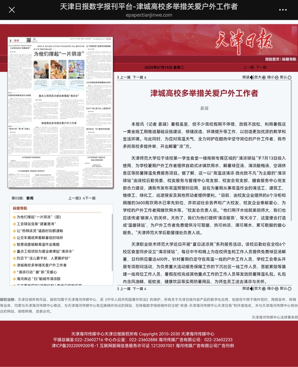 暑假虽至,但不少高校假期不停摆、放假不放松,利用暑假这一黄金施工期推进基础设施建设、修缮改造、环境提升等工作,以创造更加优质的教学和生活环境。与此同时,为应对高温天气、全力呵护在酷热中坚守岗位的户外工作者,我市多所高校多措并举,开出解暑“凉”方。 天津师范大学位于该校第一学生食堂一楼南侧专属区域的“清凉驿站”于7月13日投入使用,为学校暑期户外工作者提供自助式冰镇饮用水、解暑绿豆汤、清凉酸梅汤、空调休息区等防暑降温免费服务项目。据了解,这一以“高温送清凉 微光致不凡”为主题的“清凉驿站”由该校后勤党委、校友服务与管理中心党支部、校友会党支部、膳食服务中心党支部合力建设,遇我市发布高温预警时启用,旨在为暑期从事高温作业的清洁工、建筑工、维修工、绿化工、巡逻保安及其他劳动者提供便利。“目前,由校友企业提供的6个冷柜和捐赠的3600瓶饮用水已率先到位,并欢迎社会各界和广大校友、校友企业奉献爱心,为学校的户外工作者捐赠饮用水等。”校友会负责人说。“他们用汗水绘就美丽师大,我们也应该传递‘娘家人’的关怀。天热了,我们为他们提供‘清凉服务’,等天冷了,这里便会打造成‘温暖驿站’,为户外工作