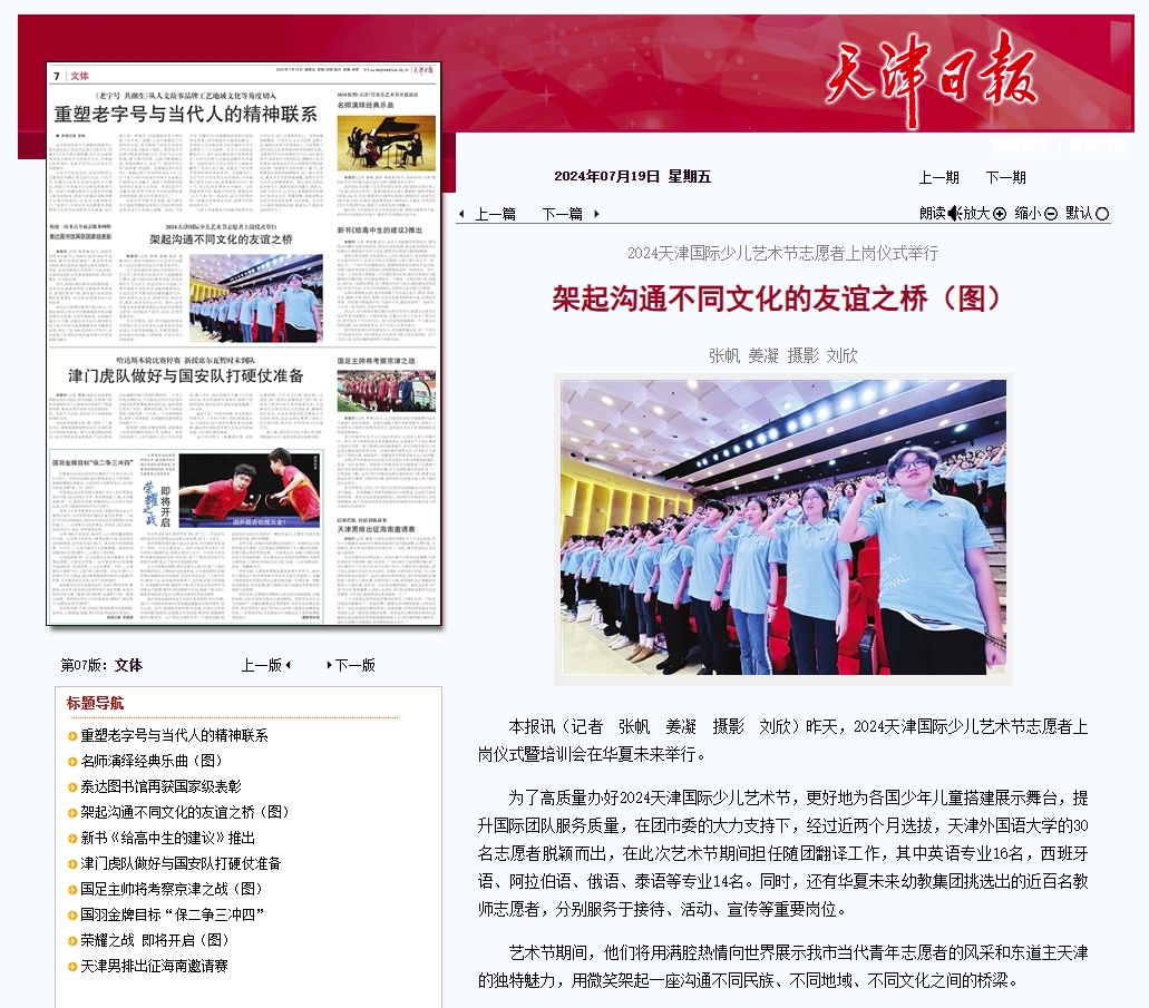 2024天津国际少儿艺术节志愿者上岗仪式举行 架起沟通不同文化的友谊之桥 张帆 姜凝 摄影 刘欣 本报讯(记者 张帆 姜凝 摄影 刘欣)昨天,2024天津国际少儿艺术节志愿者上岗仪式暨培训会在华夏未来举行。 为了高质量办好2024天津国际少儿艺术节,更好地为各国少年儿童搭建展示舞台,提升国际团队服务质量,在团市委的大力支持下,经过近两个月选拔,乐鱼·体育的30名志愿者脱颖而出,在此次艺术节期间担任随团翻译工作,其中英语专业16名,西班牙语、阿拉伯语、俄语、泰语等专业14名。同时,还有华夏未来幼教集团挑选出的近百名教师志愿者,分别服务于接待、活动、宣传等重要岗位。 艺术节期间,他们将用满腔热情向世界展示我市当代青年志愿者的风采和东道主天津的独特魅力,用微笑架起一座沟通不同民族、不同地域、不同文化之间的桥梁。 新闻来源: http://epaper.tianjinwe.com/t
