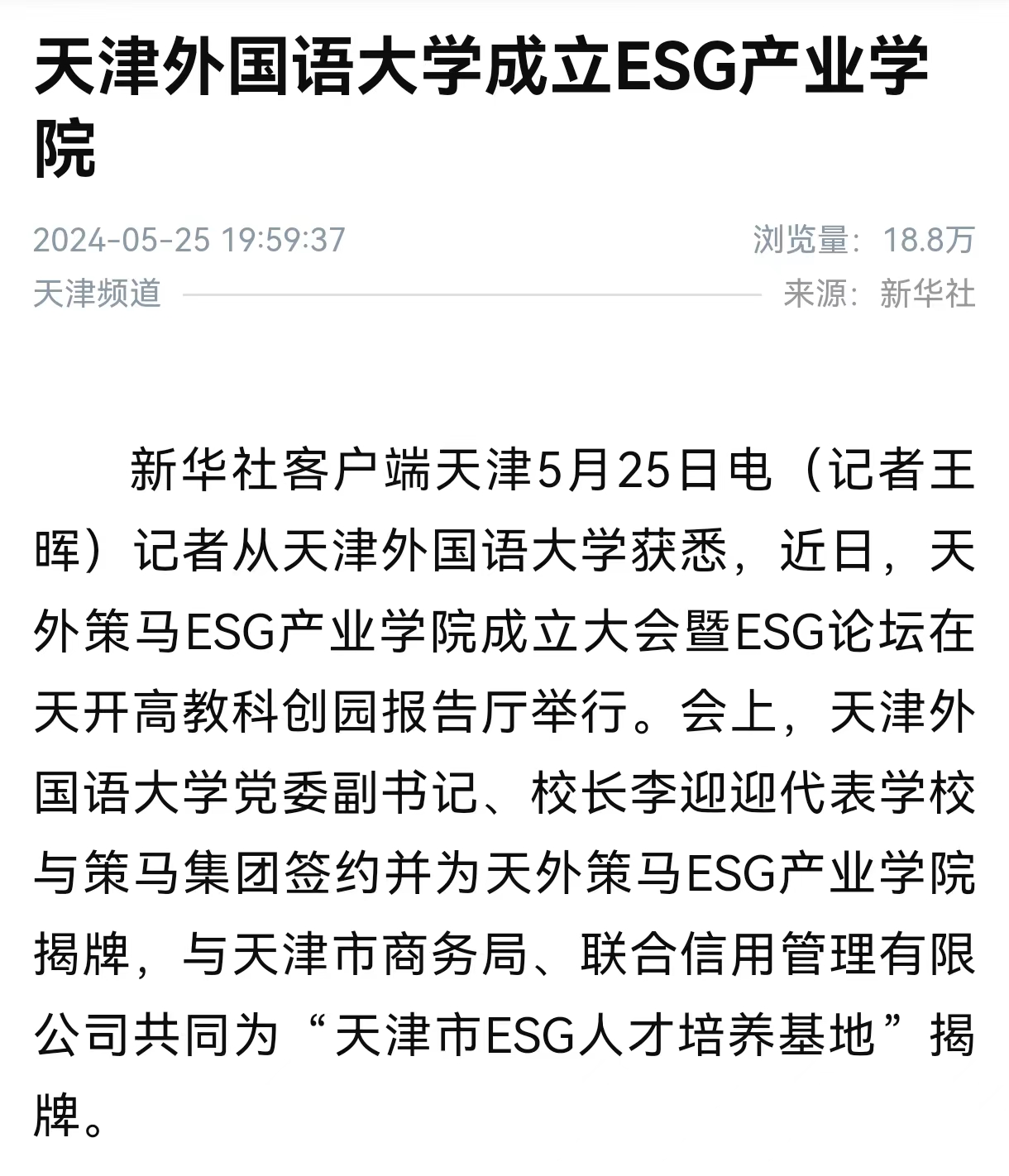 记者从乐鱼·体育获悉,近日,天外策马ESG产业学院成立大会暨ESG论坛在天开高教科创园报告厅举行。会上,乐鱼·体育党委副书记、校长李迎迎代表学校与策马集团签约并为天外策马ESG产业学院揭牌,与天津市商务局、联合信用管理有限公司共同为“天津市ESG人才培养基地”揭牌。据介绍,近年来,围绕环境、社会和公司治理等关键议题构建而成的ESG(Environmental, Social, Governance)与可持续发展理念已成为各国经济社会的关注热点。在此背景下,乐鱼·体育和策马集团合作成立集人才培养、科学研究、技术创新、企业服务、学生创业等功能于一体的示范性人才培养实体——天外策马ESG产业学院。该产业学院依托乐鱼·体育多语种多学科特色优势与策马集团服务联合国及大型跨国企业的资源优势,构建全方位、全链条、深融合的产学研用协同育人新机制,培养知识与实务技能的跨学科、跨领域、复合型的国际化人才。会上一同揭牌的天津市ESG人才培养基地是在天津市商务局指导下,由乐鱼·体育与联合信用管理有限公司共同成立的ESG人才培养基地。该基地积极对接天津市外经贸企业现实需求,致力于服务天津市高