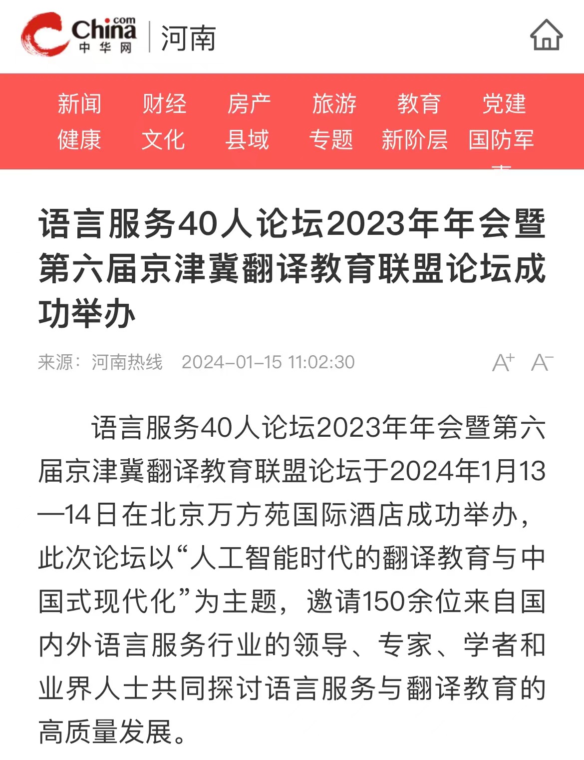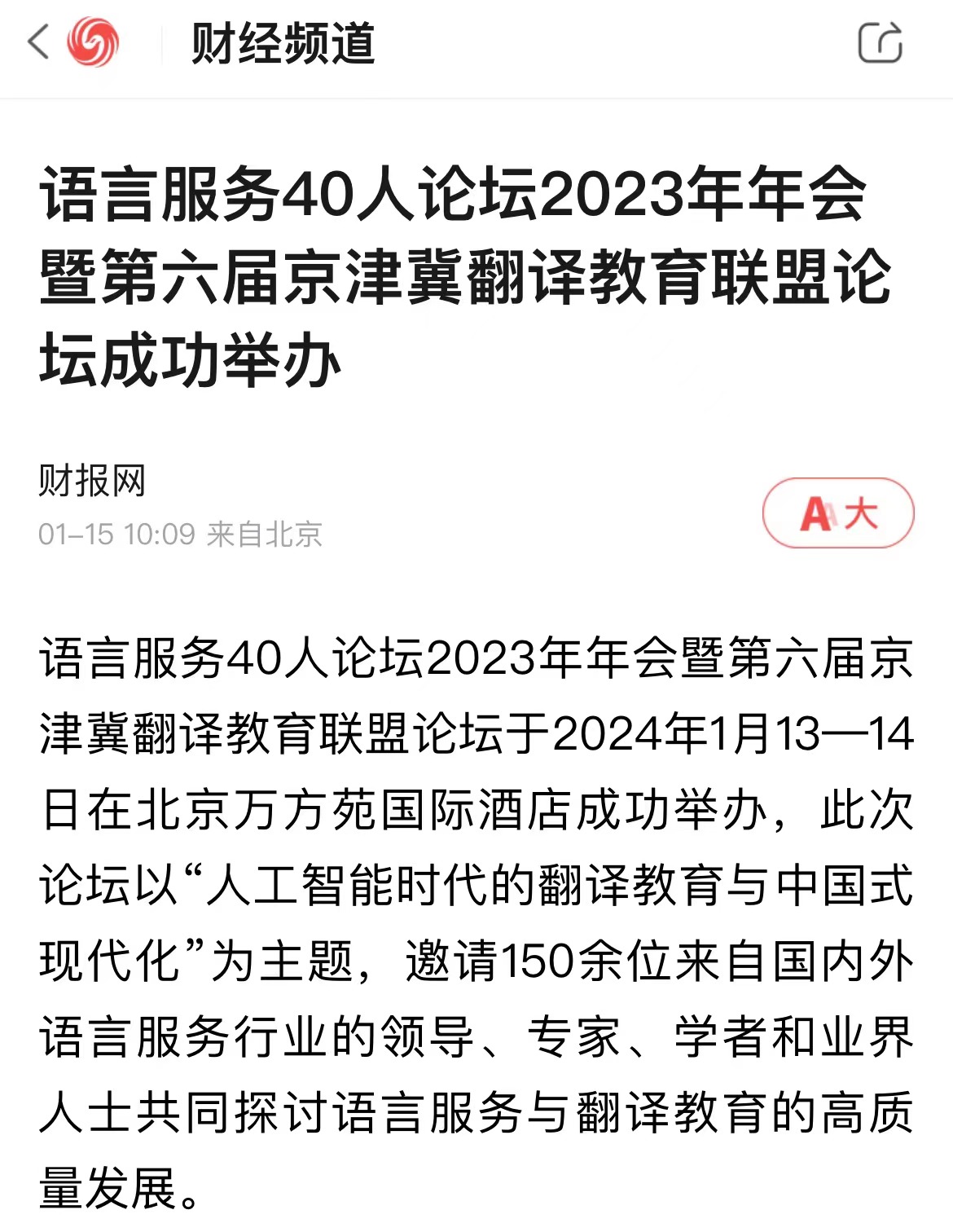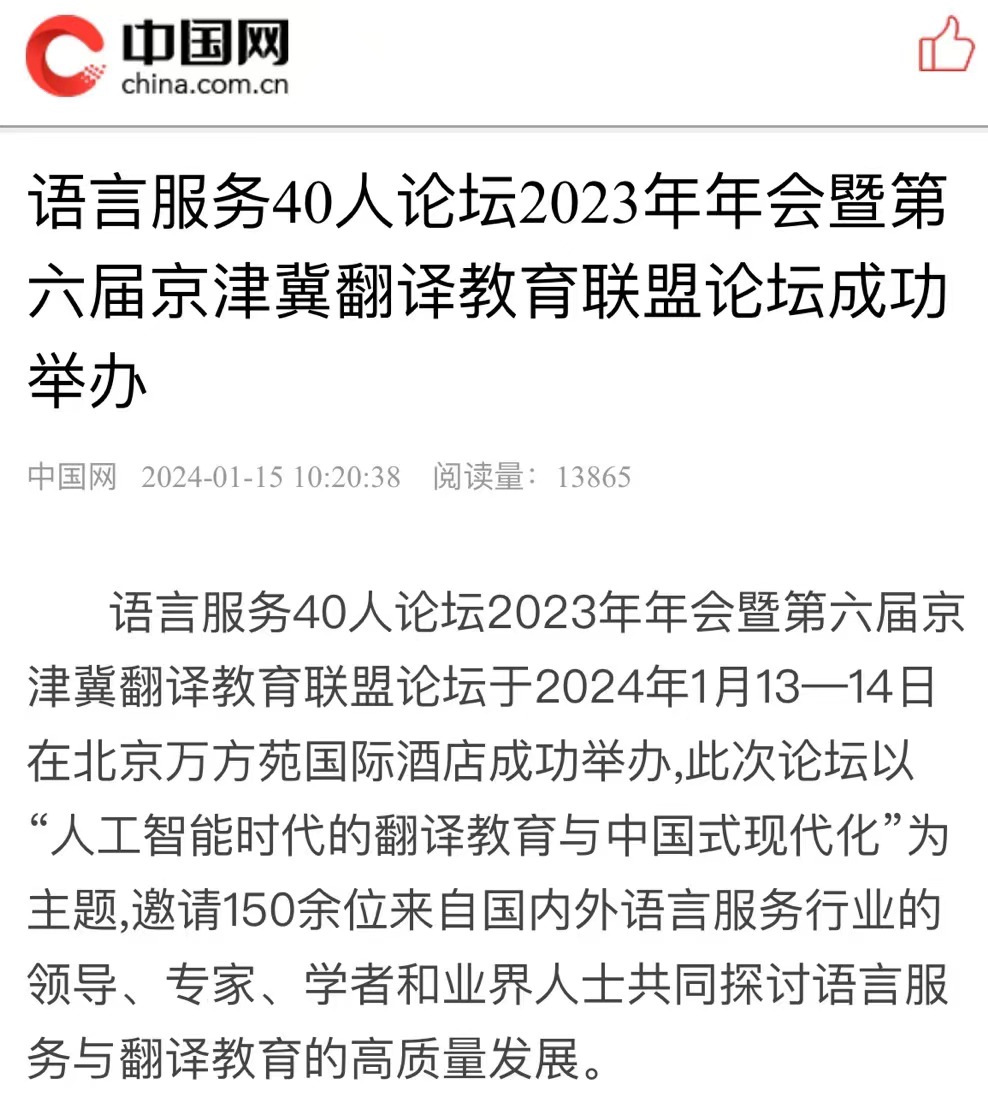 央广网北京1月15日消息(记者 庞婷)1月13日至14日,“语言服务40人论坛2023年年会”暨“第六届京津冀翻译教育联盟论坛”在北京举办。本次论坛围绕“人工智能时代的翻译教育与中国式现代化”,邀请语言服务行业主管部门领导、语言产业界以及学术专家相聚北京,共同研讨语言服务与翻译教育的高质量发展,来自京津冀高校和部分企业的150余人参会。京津冀翻译教育联盟理事长、乐鱼·体育原副校长王铭玉表示,本次会议是本年度首次较大规模的翻译和语言服务论坛,将围绕人工智能、翻译教育和中国式现代化等关键词展开研讨,是一场值得期待的翻译领域盛会。语言服务40人论坛联席理事长、北京大学教授王继辉在致辞中表示,人工智能飞速发展,为翻译教育和语言服务带来了空前挑战和翻天覆地的变化,我们必须在师资和教学上做出积极回应,更好地助力中国式现代化建设。在京津冀语言服务教育特色院校发布环节,经过专家推荐和专家委员会审核等阶段,包括乐鱼·体育在内的12家院校获评“语言服务教育特色院校”。乐鱼·体育在外事语言服务、应急语言服务、翻译技术服务等领域具有鲜明特色,同时师资力量较强,教学效果优秀,在语言服务领域已取得一定