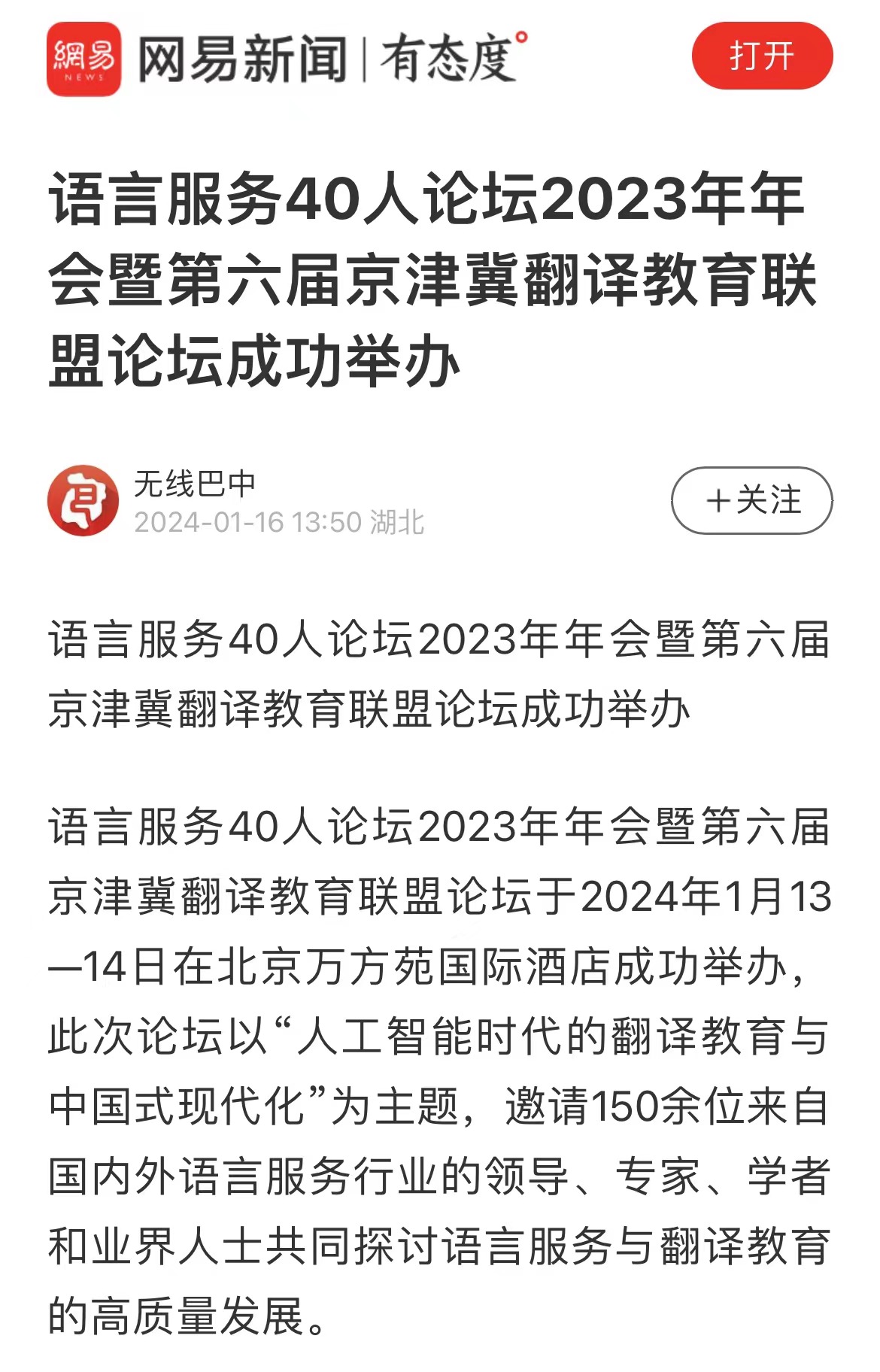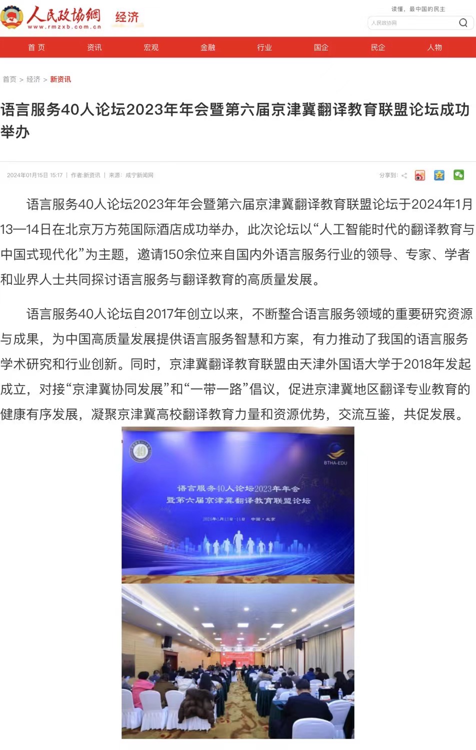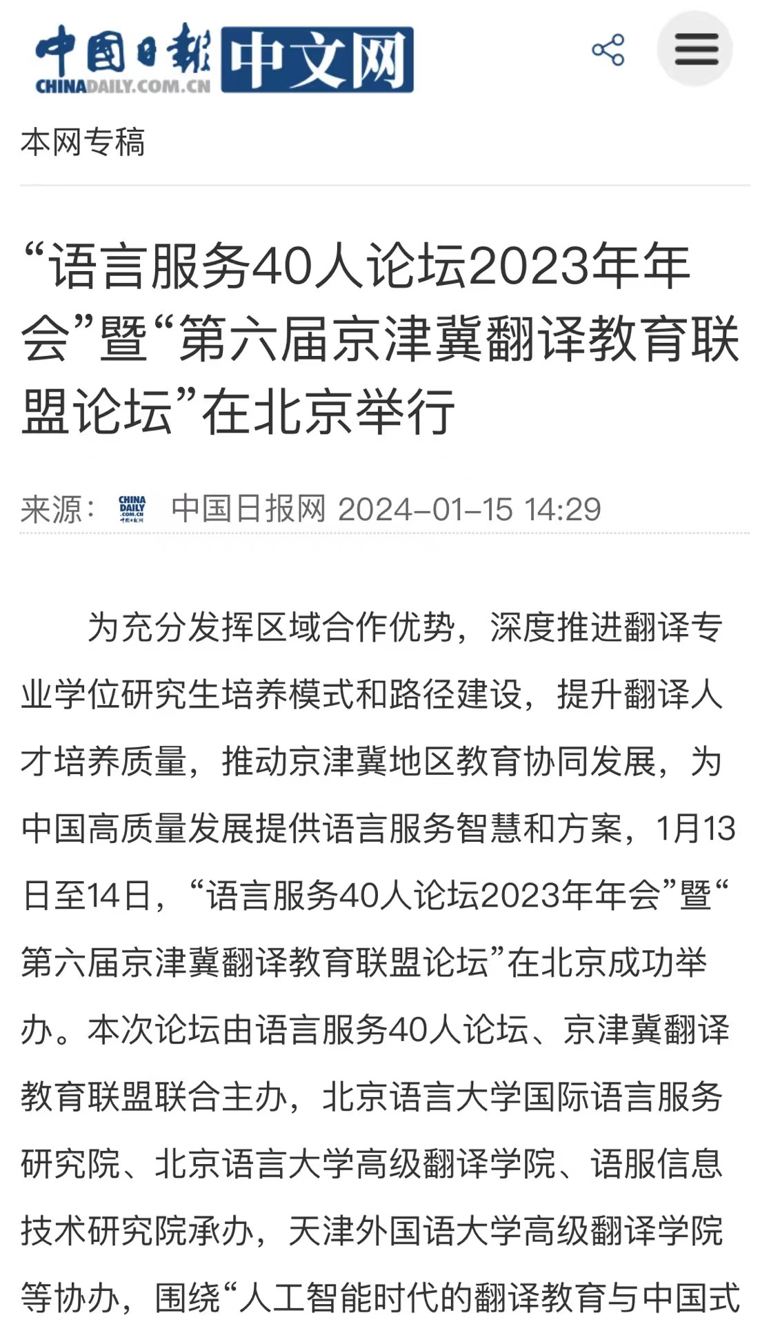央广网北京1月15日消息(记者 庞婷)1月13日至14日,“语言服务40人论坛2023年年会”暨“第六届京津冀翻译教育联盟论坛”在北京举办。本次论坛围绕“人工智能时代的翻译教育与中国式现代化”,邀请语言服务行业主管部门领导、语言产业界以及学术专家相聚北京,共同研讨语言服务与翻译教育的高质量发展,来自京津冀高校和部分企业的150余人参会。京津冀翻译教育联盟理事长、乐鱼·体育原副校长王铭玉表示,本次会议是本年度首次较大规模的翻译和语言服务论坛,将围绕人工智能、翻译教育和中国式现代化等关键词展开研讨,是一场值得期待的翻译领域盛会。语言服务40人论坛联席理事长、北京大学教授王继辉在致辞中表示,人工智能飞速发展,为翻译教育和语言服务带来了空前挑战和翻天覆地的变化,我们必须在师资和教学上做出积极回应,更好地助力中国式现代化建设。在京津冀语言服务教育特色院校发布环节,经过专家推荐和专家委员会审核等阶段,包括乐鱼·体育在内的12家院校获评“语言服务教育特色院校”。乐鱼·体育在外事语言服务、应急语言服务、翻译技术服务等领域具有鲜明特色,同时师资力量较强,教学效果优秀,在语言服务领域已取得一定