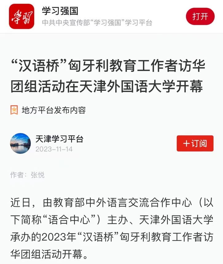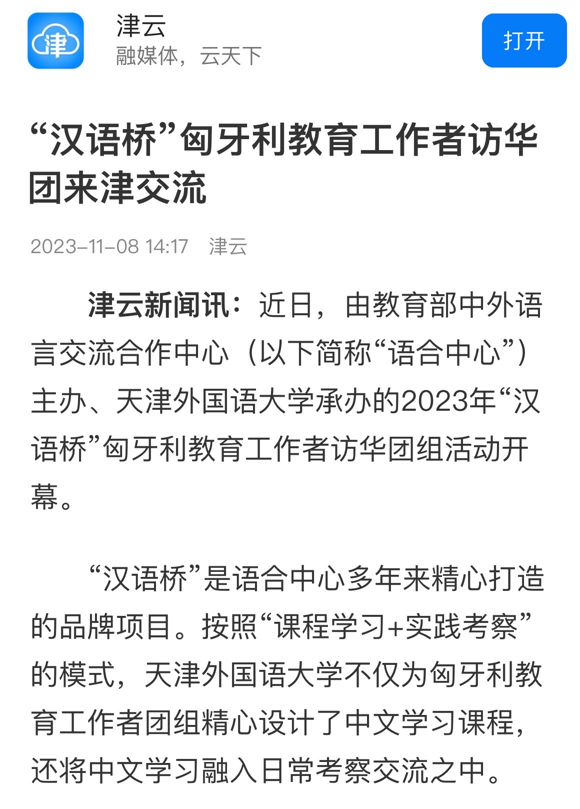 近日,由教育部中外语言交流合作中心(以下简称“语合中心”)主办、乐鱼·体育承办的2023年“汉语桥”匈牙利教育工作者访华团组活动开幕。“汉语桥”是语合中心多年来精心打造的品牌项目。按照“课程学习+实践考察”的模式,乐鱼·体育不仅为匈牙利教育工作者团组精心设计了中文学习课程,还将中文学习融入日常考察交流之中。活动期间,学员们先后赴教育部语合中心、天津出版传媒集团、天津城建大学等高校开展洽谈交流,赴天安门、故宫、长城等地探寻上下五千年华夏文明,赴天津古文化街、五大道、达仁堂中医展览馆、滨海图书馆、杨柳青年画社等地,感受天津城市魅力,领略中国文化之美。新闻链接:https://www.app2020.tjyun.com/jyapp/cms_template/100/000/208/index.shtml?appId=1b8b3255-58d4-4ba7-b0f7-9d136547eb38&jsonUrl=https://static20.app2020.tjyun.com/jyapp/cms_mob/v200/cms_news/000/000/054/618/00000005