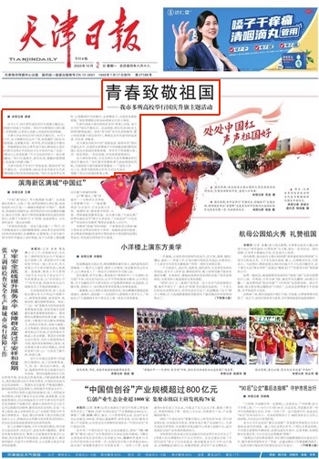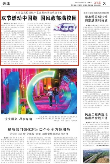 本报讯(记者李杨)圆月当空,红旗飘扬,双节氛围燃动天津各大高校校园,青年学子以独特的方式尽情书写对祖国的热爱。“山绿起来人富起来,天地间回荡着中国节拍,我们的笑脸映辉风景的色彩,中国又一个新时代……”泮湖岸边,秋兰飘香,天津工业大学校园内载歌载舞。假日期间,该校校工会组织了主题为“红歌礼赞新时代 同心共抒爱国情”的国庆红歌云竞猜活动,其竞答内容选自中宣部《庆祝中华人民共和国成立70周年优秀歌曲100首》曲库以及学习强国《百年红色经典》专辑,吸引师生们积极参与。“每一处光景都是锦绣中国。活动的开展,不仅加强了对学校广大师生的爱党爱国爱社会主义教育,更加深了大家对祖国的热爱之情,营造了文明和谐、欢乐健康、积极向上的良好节日气氛。”校工会相关负责人表示。择菜、切菜、和馅、擀皮、包饺子,不一会儿,饺子诱人的香气逐渐在空气中弥漫开来,整个餐厅香味四溢。日前,天津中医药大学举办“石榴籽 心连心 同心共祝中国节”主题传统文化实践活动。在阵阵笑声中,一个个承载着浓浓温情的饺子被送到了同学手里,大家一边分享劳动的喜悦,一边道出对祖国的热爱与祝福。随后,大家在中药学院志愿者讲解员的带领下来到药山识辨百草,