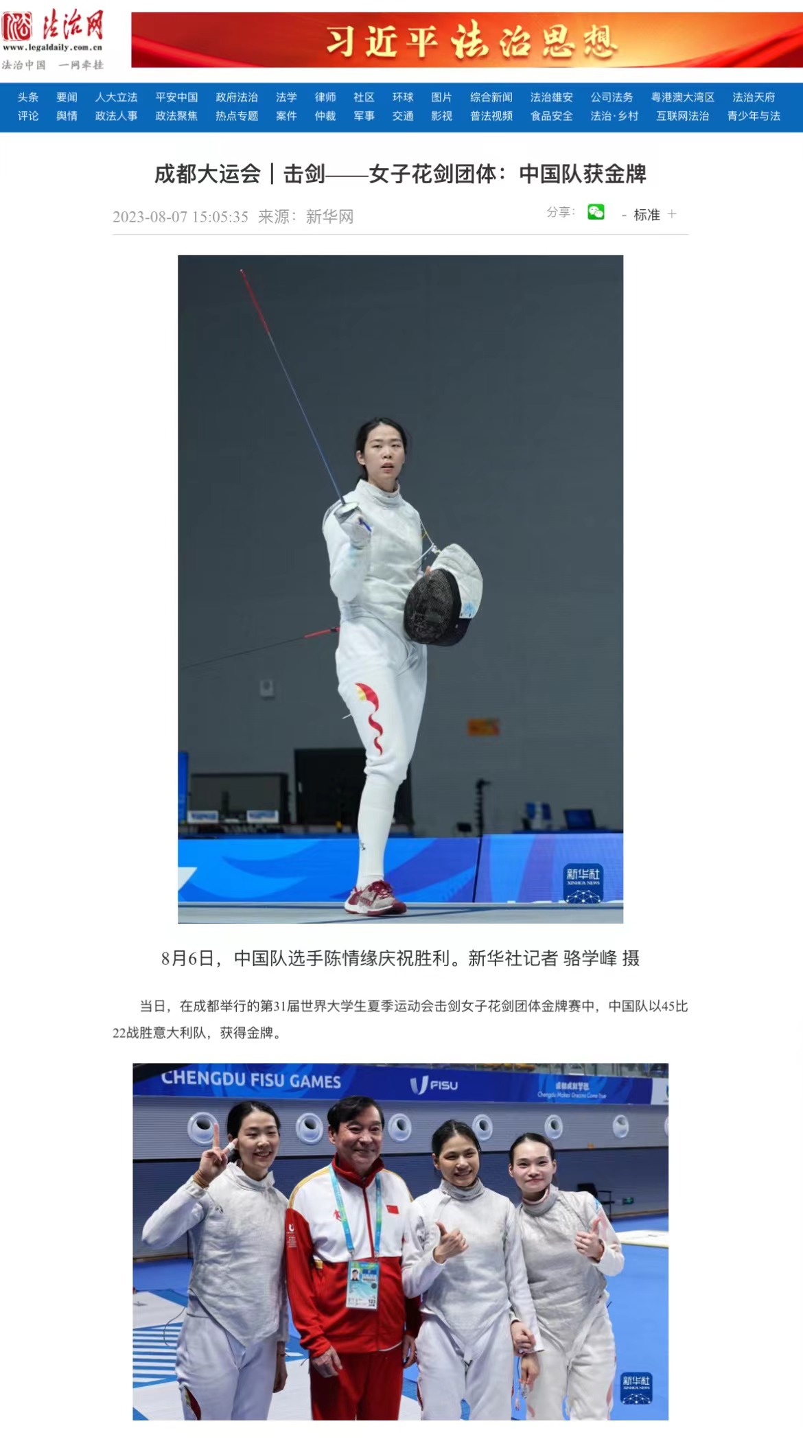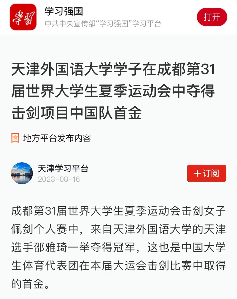 中国击剑队首金精彩赛况回看8月4日,在郫都区体育中心体育馆进行的成都大运会击剑项目比赛中,天津姑娘邵雅琦在女子佩剑个人赛决赛中折桂,为中国队夺得本届大运会击剑项目的首枚金牌;中国香港队选手张家朗夺得男子花剑个人金牌,为中国香港击剑队在本届大运会上收获第二块金牌。邵雅琦夺得击剑项目中国队首金在当天小组赛阶段,邵雅琦状态并不理想,但进入到淘汰赛后她越战越勇,过关斩将闯进决赛。决赛中,开场后邵雅琦与韩国选手崔知英依次得分,场面陷入胶着,此后邵雅琦主动求变,向对手展开犀利攻势,以8:4领先结束首局。第二局,邵雅琦稳扎稳打,没有给对手太多机会,以15:10拿下比赛。“比赛中,我一直在寻找一个与韩国选手对战更容易得分的步伐,前半段我一直在尝试,中间的时候找到了突破点;下半场的时候,因为身体有点疲劳,被对手连得几分。”赛后,被问到决赛最后时刻的把握,邵雅琦说道,“不管怎样,当时就一个心情,那就是要赢。这份心情支撑我打完最后这几分。”在女子佩剑个人赛决赛中谈及夺冠后的感受,邵雅琦表示,“非常开心。虽然今天没有达到完美的发挥,但是能获得金牌是对我自己最大的肯定。现场热烈的氛围也帮助很大。”张家朗首次出战