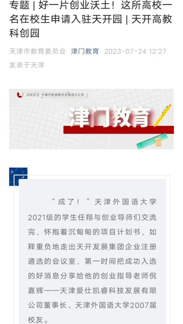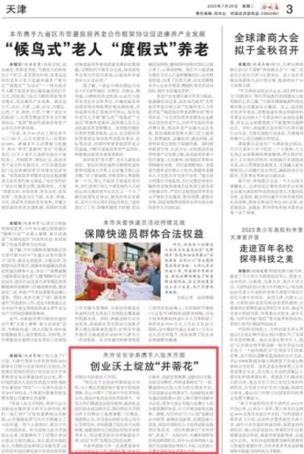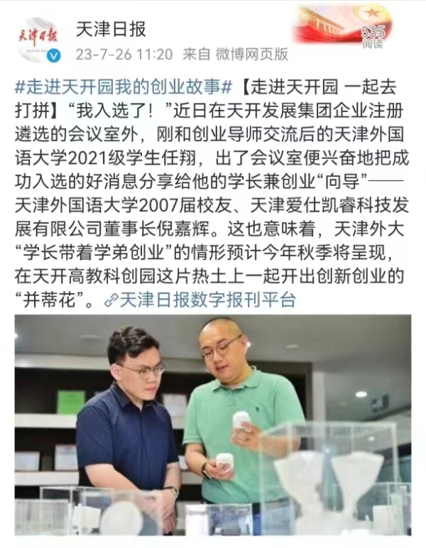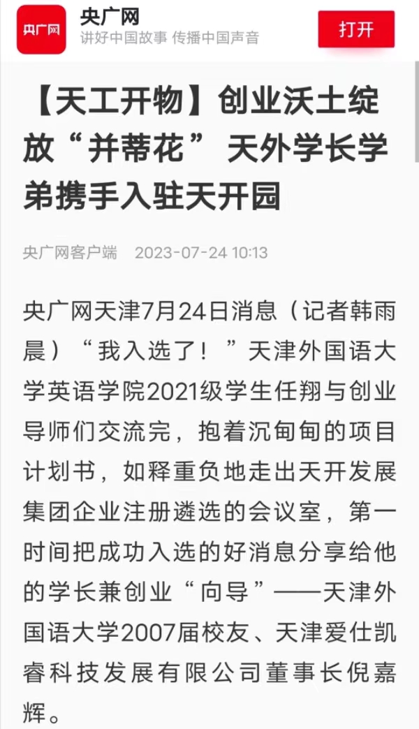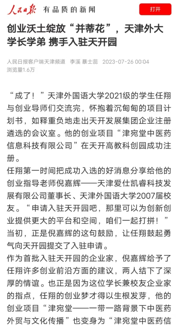 “我入选了!”近日在天开发展集团企业注册遴选的会议室外,刚和创业导师交流后的乐鱼·体育2021级学生任翔,出了会议室便兴奋地把成功入选的好消息分享给他的学长兼创业“向导”──乐鱼·体育2007届校友、天津爱仕凯睿科技发展有限公司董事长倪嘉辉。这也意味着,天津外大“学长带着学弟创业”的情形预计今年秋季将呈现,在天开高教科创园这片热土上一起开出创新创业的“并蒂花”。 “申请入驻天开园吧,那里可以为创新创业提供更大的平台和空间,咱们一起打拼!”任翔告诉记者,正是倪嘉辉的这句鼓励,使他鼓起勇气向天开园提交了入驻申请。“有了学长兼校友企业家的指点,我的创业梦得以生根发芽。”任翔说,他俩相识于乐鱼·体育里的一次访谈,当时作为天开园首批入驻企业家之一,倪嘉辉给了任翔许多创业的建议。也正由此,任翔决定将其所创的津宛堂中医药信息科技有限公司注册在天开园。“我生于名医张仲景的故乡南阳,从小便在耳濡目染中接受中医药的熏陶。学校为我们聘请创业指导教师、提供机会结识创业成功的学长,指导我在天开园这样的舞台上施展拳脚。”任翔说。倪嘉辉则表示,共同创业的师兄弟之间可以互帮互助,学校可以给予大家科研和人