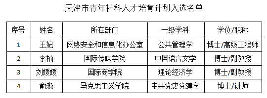 日前,天津市社会科学界联合会公布了天津市青年社科人才培育计划入选名单,我校四位青年教师凭借优秀的学术成果和科研创新潜力成功入选,充分体现了学校在青年社科人才培养方面的显著成效。 插入图1 天津市青年社科人才培育计划在市委宣传部指导下,由市社科联负责组织实施,旨在为国家、市级高层次人才工程输送更多后备力量,建设我市国家级和市级社科后备人才“蓄水池”。 学校始终高度重视青年人才培养和梯队建设,通过项目培育、专家指导、政策支持、经费保障等多方面措施,为青年教师开展科学研究提供良好环境。未来,学校将进一步深化学术交流合作、促进学科交叉融合发展,鼓励入选教师以此次培育计划为契机,在各自研究领域深耕细作,
