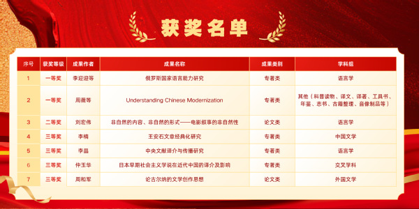 近日,第十九届天津市社会科学优秀成果奖获奖名单正式公布。天外再创佳绩,共有7项成果荣获嘉奖,包括一等奖2项、二等奖1项、三等奖4项,取得了历史最佳成绩。其中,李迎迎教授等完成的《俄罗斯国家语言能力研究》与周薇教授等完成的Understanding Chinese Modernization双双折桂,荣获一等奖。天津市社会科学优秀成果奖是天津市哲学社会科学类成果最高奖,由中共天津市委、天津市人民政府联合颁发,每两年评审一次,旨在评选出具有较高学术价值和较大社会反响的优秀成果。该奖项对于学科建设、人才培养具有极高的价值。为做好本届奖项的申报工作,学校科研处与各二级学院提前谋划、精心组织,对申报政策
