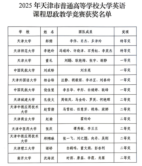 日前,天津市普通高等学校大学英语课程思政教学竞赛决赛在天津大学顺利举行,经过初赛的学校评比、复赛的网络专家评审以及决赛的现场展示评比,我校通识教育学院教师相会锋带领的教学团队凭借出色的课程思政教学设计能力和扎实的现场表现,最终荣获天津市大学英语课程思政教学竞赛一等奖,并将于今年11月代表天津市参加全国外语课程思政优秀教学案例征集与交流活动。本次竞赛由天津市教育委员会主办,天津大学承办,高等教育出版社协办,旨在深入推进大学英语教学与课程思政的有机融合,全面落实立德树人根本任务。竞赛面向天津市各高校大学英语教学团队,要求围绕指定教学单元进行完整的课程思政教学设计,充分挖掘语言素材中的育人元素,实现