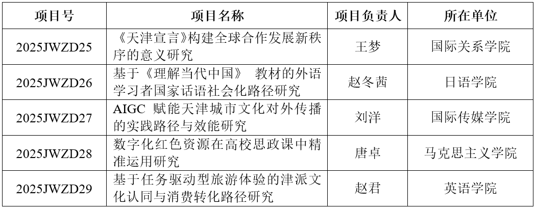 日前,全国哲学社会科学工作办公室、教育部社会科学司、天津市哲学社会科学工作办公室、天津市艺术科学规划办公室相继公示了2025年国家社会科学基金中华学术外译项目、2025年度教育部人文社会科学研究规划基金、2025年天津市哲学社会科学规划年度课题、研究阐释党的二十届四中全会精神天津市社科规划智库专项和2026年度天津市艺术科学规划项目的立项名单,我校共有12项课题获批立项。2025年国家社会科学基金中华学术外译项目拟立项名单序号项目类别学科领域姓名所在单位课题名称1一般项目中国历史高晓婷亚非语学院敦煌石窟艺术 2025年度教育部人文社会科学研究规划基金立项一览表序号项目类别学科领域姓名所在单位课