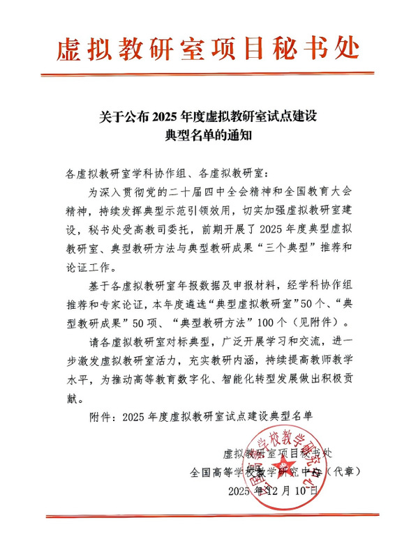 12月11日,教育部2025年度虚拟教研室试点建设典型名单正式公布。由天外牵头建设的“理解当代中国日语系列”虚拟教研室荣获“典型教研方法”称号,充分彰显了学校在推动新文科建设、深化课程思政改革、创新外语教学模式方面的引领性与示范性。“理解当代中国日语系列”虚拟教研室聚焦用日语讲好中国故事、传播中国声音的核心任务,积极探索“线上线下协同,赛教融合引领,赋能课程思政创新实践”的教研新范式。该模式依托虚拟教研室平台,打破地域与校际壁垒,整合全国优质教学与研究资源,构建了跨校协同、共建共享的教研共同体。教研室立足国家战略与人才培养需求,将课程思政有机融入日语专业教学全过程,通过系统化设计教学内容、创新